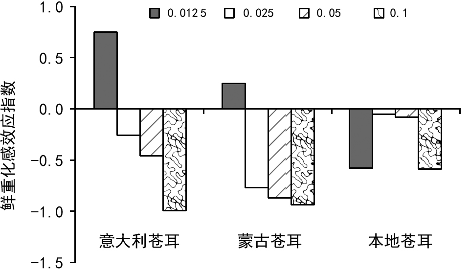 不同种苍耳子、不同浓度浸提液对小白菜种子幼苗鲜重及其化感效应指数的影响大小比较见图5、图6。