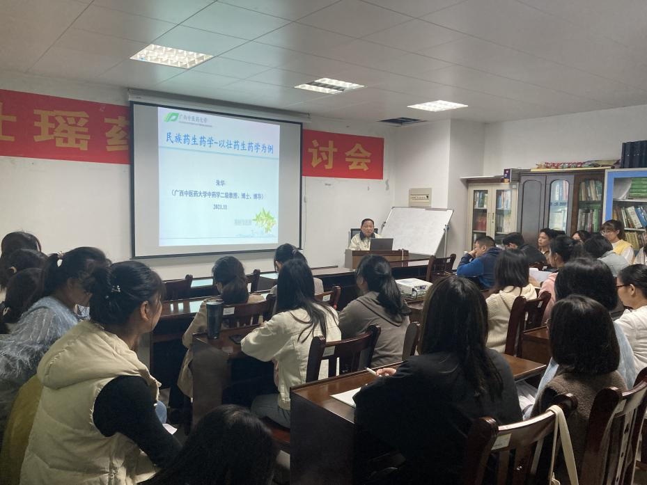 2021年11月12日晚19:00-20:30,本团队朱华教授在格物楼C408会议室做了题为“民族药生药学-以壮药生药学为例”的壮瑶药研究学术报告,会议由实验室常务副主任苏健博士主持,壮瑶药研究团队学术骨干田慧、梁爽、李丹妮、陈龙等师生与会。