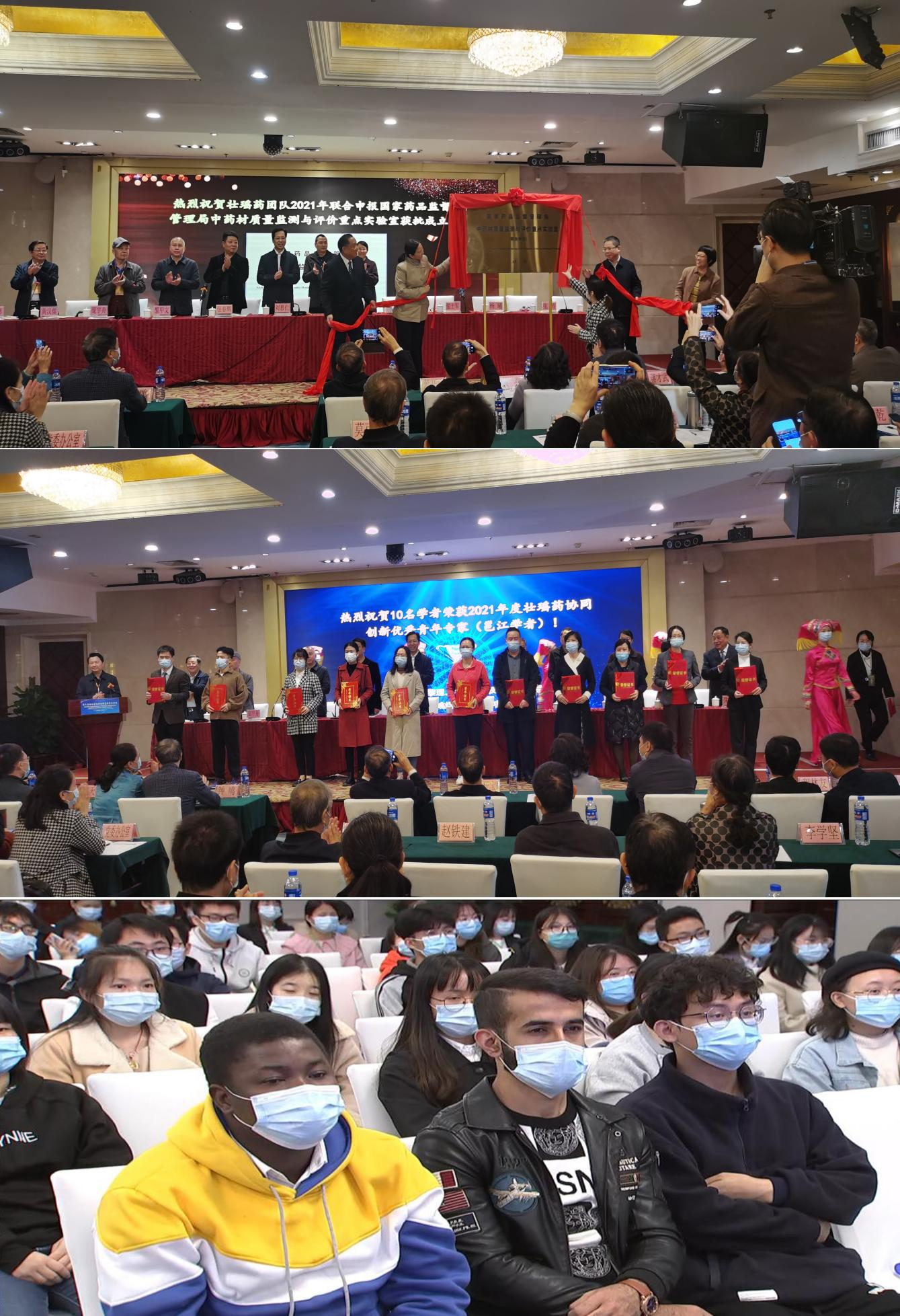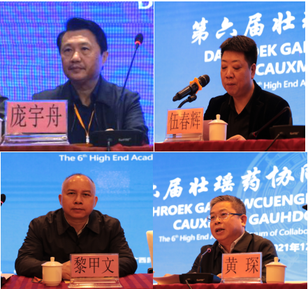 论坛举行2021年壮瑶药协同创新研究突出成果展示揭幕仪式,一是壮瑶药理论研究守正创新,理论成果《瑶药材犁头草、铁皮石斛的研究》《壮瑶药研究(第六期)》等专著由广西科技出版社正式出版发行;二是广西壮瑶药高层次人才民族医药(瑶医药)博士研究生本土化培养有新突破;三是“壮药药材学创建与质量标准研究成果”首次获得广西科学技术奖自然科学类二等奖;四是壮瑶药协同创新成果“广西产壮药材铁皮石斛生长途径调控与品质相关性的研究”获中国民族医药协会科学技术奖一等奖、为广西产铁皮石斛的规范化种植提供科学依据与关键技术。五是“壮药旱田草等5个品种质量评价与标准研究”成果获广西医药卫生适宜技术推广奖一等奖,创新壮药材质量标准关键技术,对建立规范、可控的壮药材质量标准起到示范和引领作用。六是研究平台与团队建设上台阶,联合申报国家级药品重点实验室—“国家药监局中药材质量检测与评价重点实验室”通过认定,为实现广西国家级药品重点实验室“零”突破作出新贡献,论坛举行了“国家药品监督管理局中药材质量监测与评价重点实验室(联合单位)”揭牌仪式;七是中医药壮瑶医药重大疾病防治研究有新发展, 承担国家科技部“中外合作壮医药防治新型冠状病毒感染肺炎的产品研制与应用”项目。 八是壮瑶药协同创新产业化成果效益显著,协同研制了“桂北芦丁槐米”、“薏米百益粉”、“防疫香囊”及“沙罗玉山佛茶”等4个新产品。