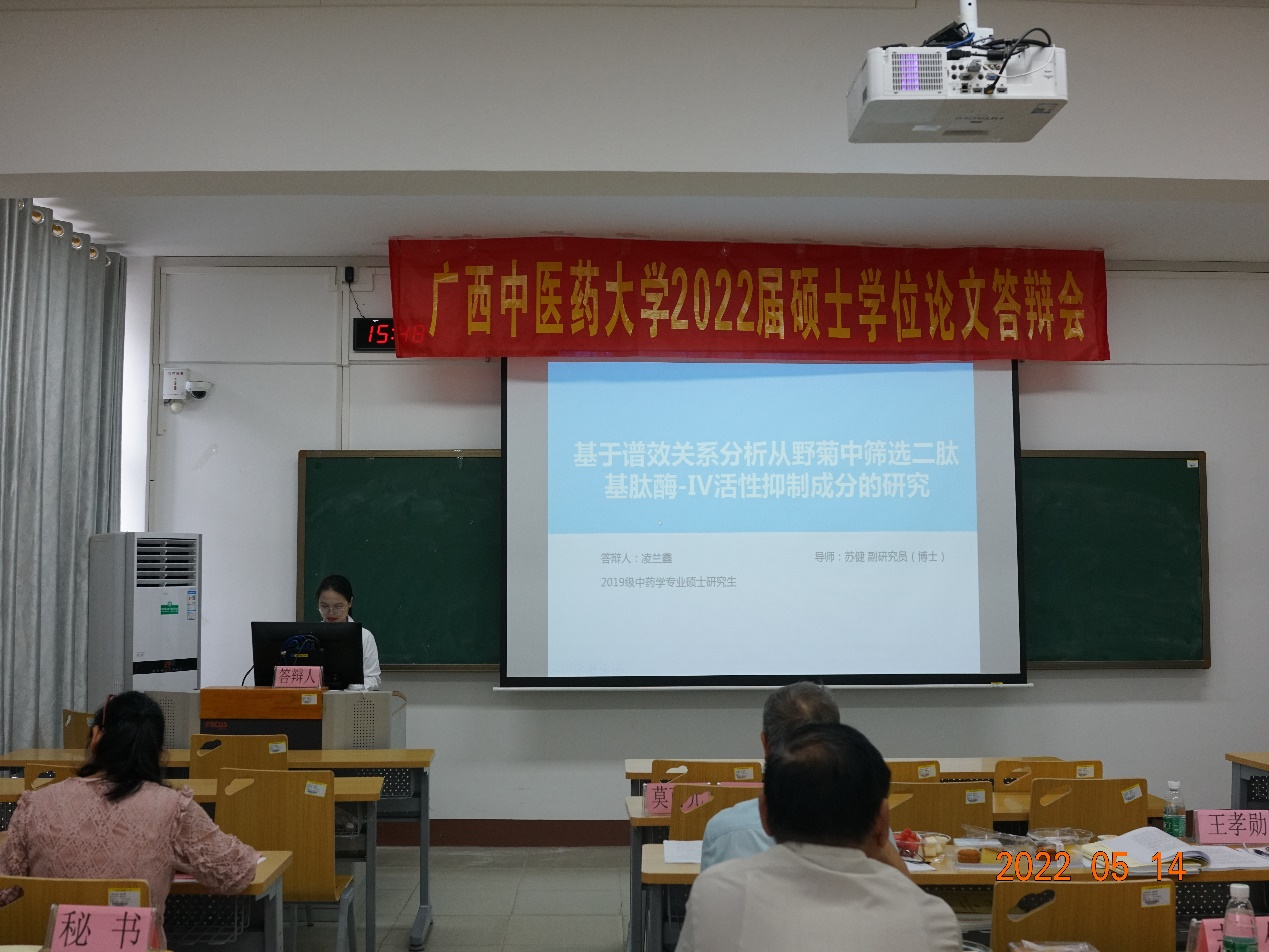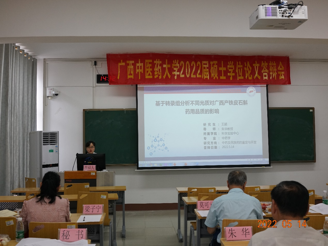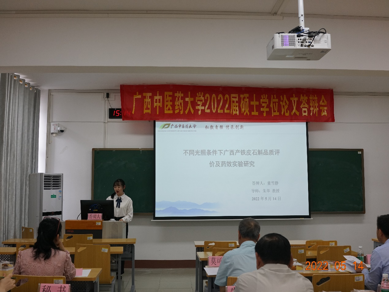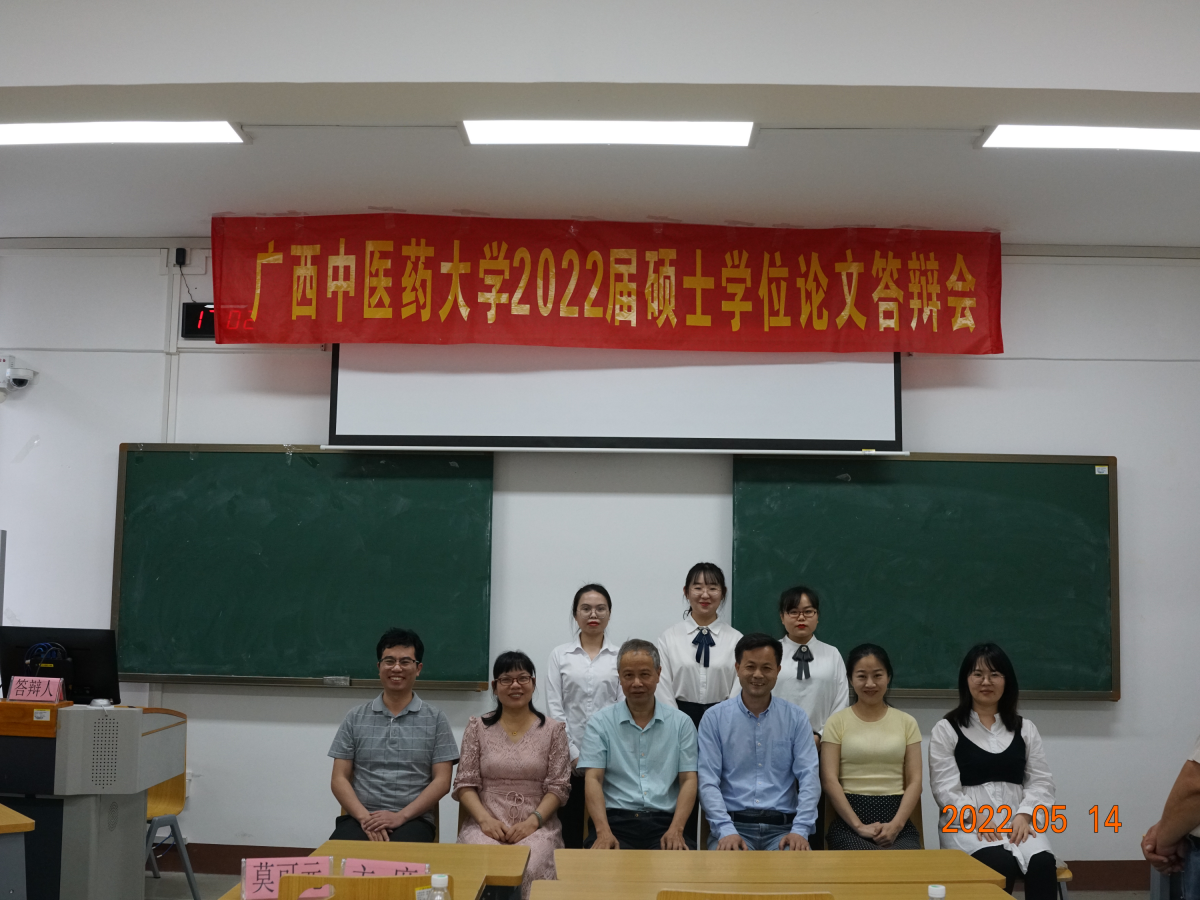 5月14日下午,平台实验室硕士研究生毕业答辩会于星空彩票老版本下载明秀校区时珍楼6-606教室顺利召开。本次答辩对象为2019级研究生。答辩会主席为自治区人民医院莫可元主任中药师,答辩委员会委员有星空彩票老版本下载梁子宁博士教授、王孝勋博士研究员、梁爽高级实验师、戴忠华博士副教授,答辩秘书张淼老师。