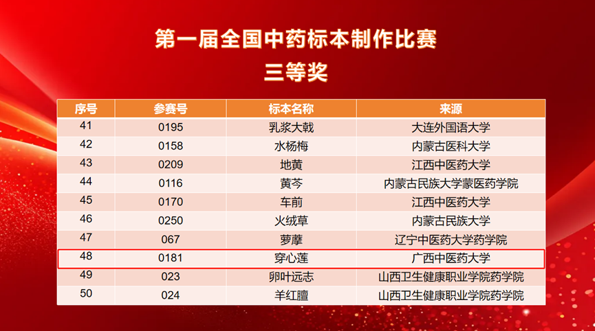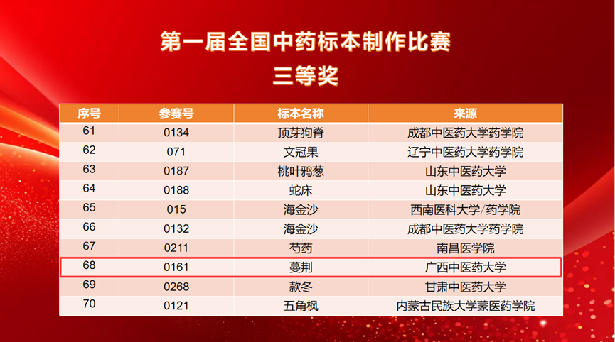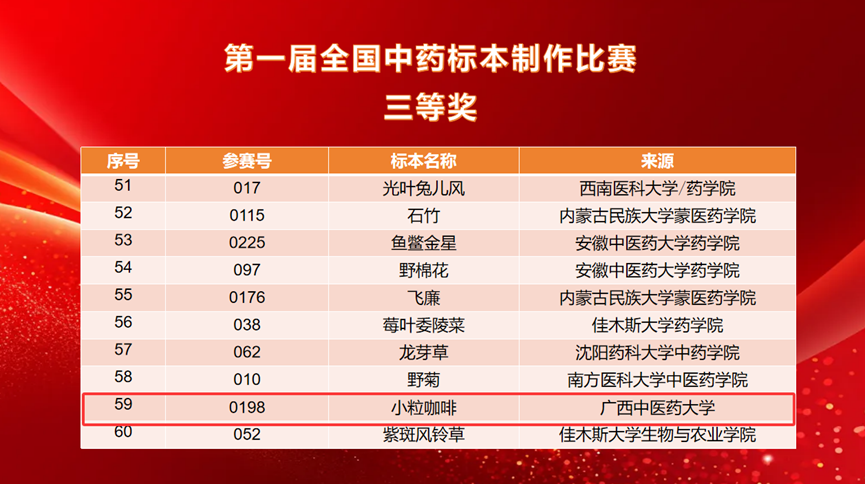 经过前期的精心准备与选拔,我校壮瑶药研究平台派出3名教师带队,11名研究生参赛,共提交16件标本作品。比赛中,我校壮瑶药重点实验室研究生吴文源同学(指导老师:朱华、戴忠华)制作的药用植物标本《檀香》荣获第一届全国中药标本制作比赛二等奖;研究生何丽霞、韦杰玉、陈德栋等同学制作的《假鹰爪》《重瓣臭茉莉》《穿心莲》《小粒咖啡》《蔓荆》《赪桐》《磨盘草》《佩兰》等八件药用植物标本荣获第一届全国中药标本制作比赛三等奖,充分展示了我校在中药标本制作与中医药教育领域的深厚实力与学子昂扬向上的精神风貌。