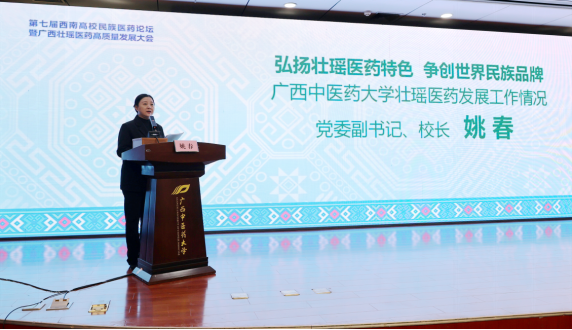 姚春介绍了我校在壮瑶医药理论研究、人才培养、科技创新、服务社会等方面取得的一系列重大突破。她表示,学校将以更加坚定的文化自信,深化对壮瑶医药理论精髓、诊疗技术和养生文化的系统挖掘与活态传承;将以更加开放的创新姿态,融汇现代科技,聚力攻克关键核心技术瓶颈,不断提升壮瑶医药科学价值和应用水平;将以更加广阔的国际视野,依托广西独特的区位优势,积极拓展国际合作新渠道,推动壮瑶医药更深入地走向世界,将壮瑶医药打造成为一张闪亮的“中国名片”和“广西名片”。