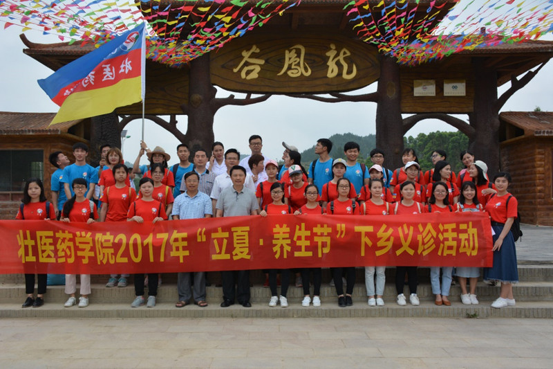 2017年5月6日,壮医药学院来到南宁良庆区龙凤谷开展了“立夏 养生节”下乡义诊活动。星空彩票老版本下载庞宇舟副校长,壮医药学院蓝毓营院长、韦英才副院长莅临现场指导,壮医药学院团委副书记刘婷老师,教学办张青槐老师以及2013级壮医学专业35名学生参加了此次活动。