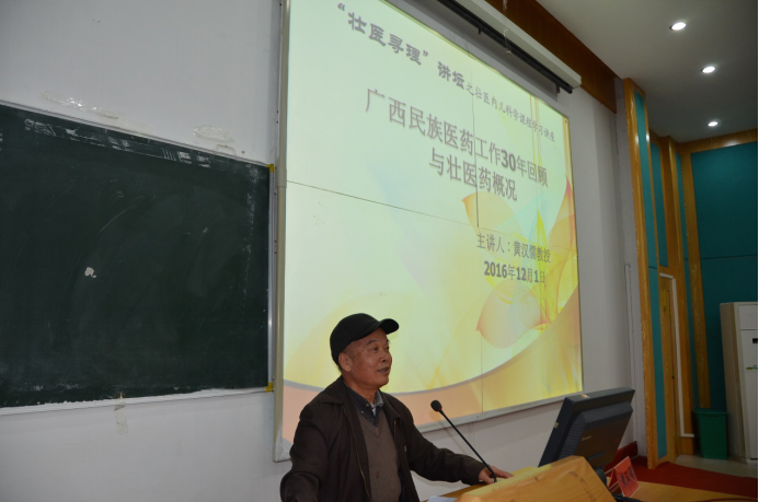 接下来,黄汉儒教授作了以“广西民族医药工作30年回顾与壮医药概况”为主题的精彩讲座。黄老回顾了广西民族医药工作30年的发展历程,他旁征博引、引经据典,用诙谐幽默的语言、生动形象的例子深入浅出地讲述了广西民族医药发展的艰辛以及取得的成果。此外,黄老还生动形象地概述了壮医药理论、诊疗技法等壮医药的概况,并结合自身的经历以及民族医药的发展,诠释了持之以恒、无怨无悔地为民族医药发展而努力奋斗的医者精神、学者精神,最后黄老鼓励同学们努力学习壮医、发展壮医、建设壮医。