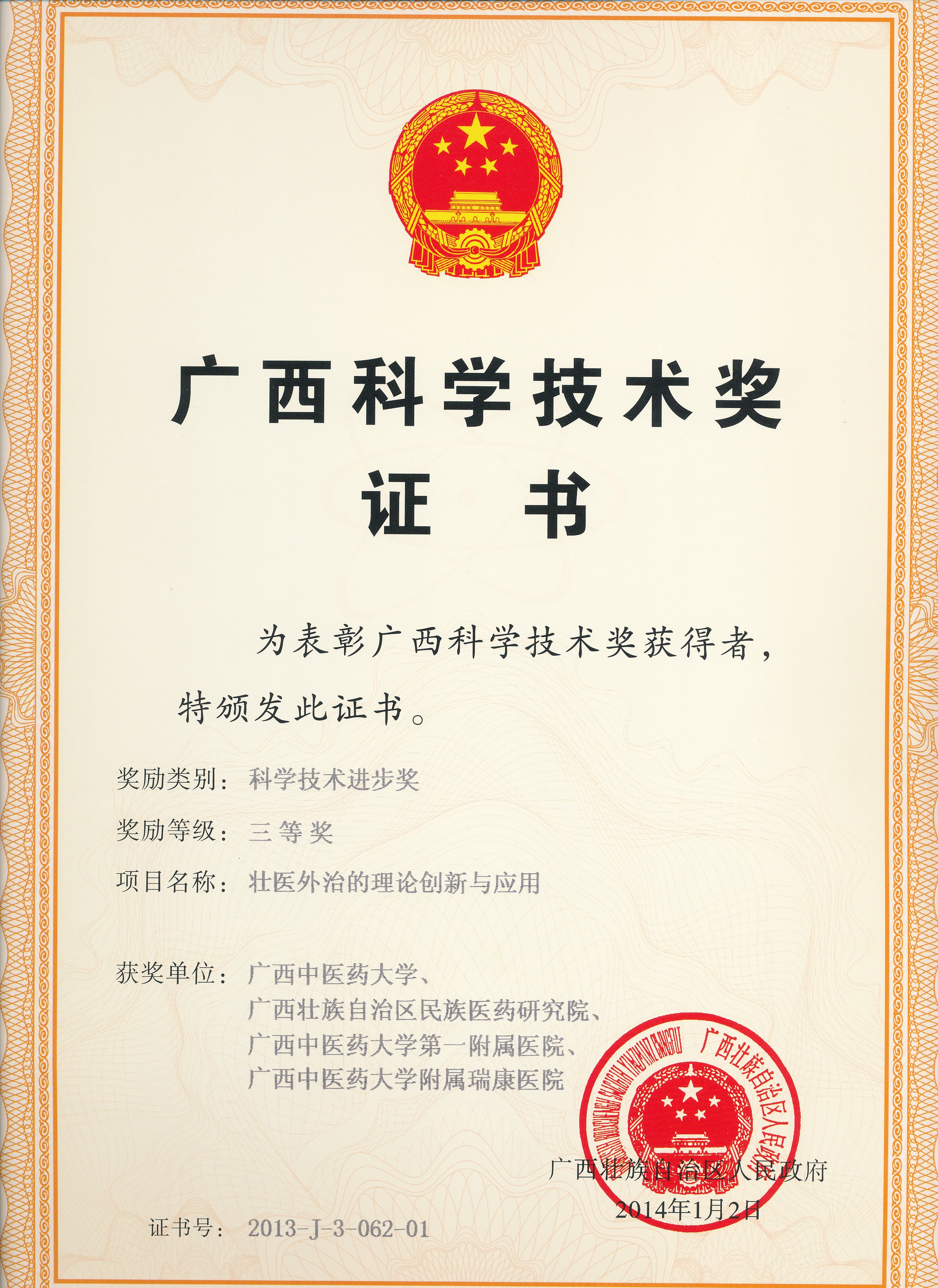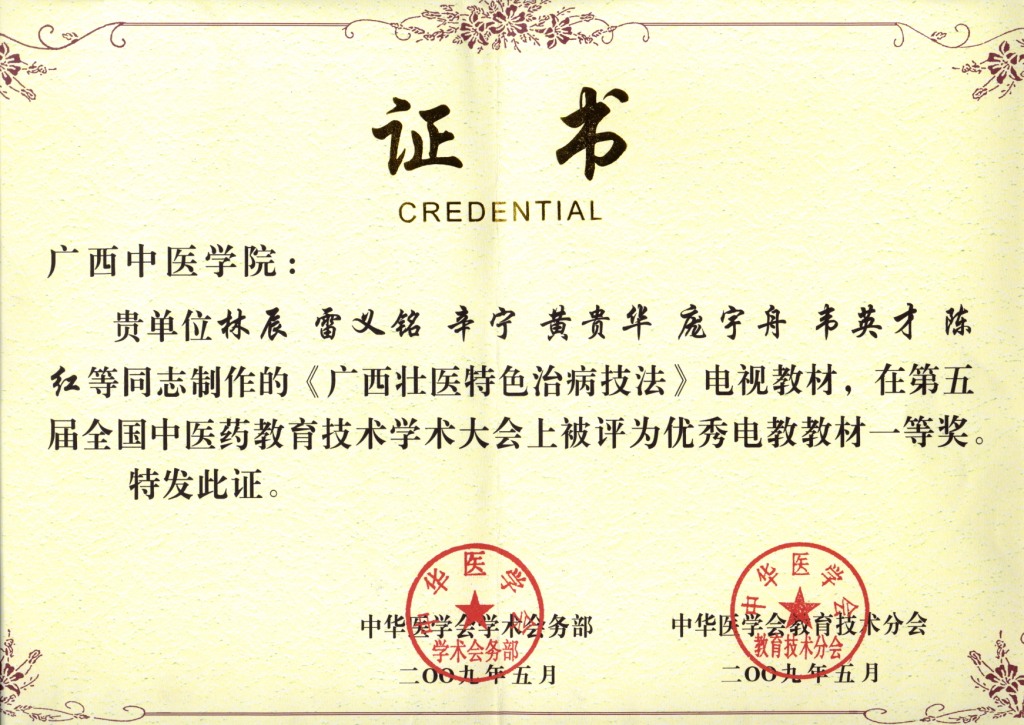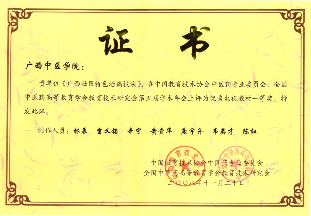 虽然壮医特色疗法教研室成立在后,但是《壮医特色疗法》、《壮医经筋学》的教材建设却从未停止过。2008年,收集整理广西民间壮医特色治病技法出版的视听教材《广西壮医特色治病技法》,获得2008年中国教育技术协会中医药专业委员会、全国中医药高等教育学会教育技术研究会第五届学术年会优秀电视教材一等奖。2008年壮医特色教材《壮医经筋疗法》获得自治区级重点教材立项,经过6年的精心酝酿,于2014年11月正式出版《中国壮医经筋学》。2012年,我校《壮医药系列教材》获全国中医药行业“十二五”规划教材立项,其中《壮医外治学》、《壮医经筋学》也作为““十二五”规划教材之一,教材编写整合、更新和优化起点低、陈旧、重复、形式单调、结构体系零乱的教学内容,突出教材综合性、设计性、创新性建设。充分挖掘壮医特色疗法、壮医经筋疗法资源优势,整合壮医药最新成果,以培养实用型特色人才为目标,修订新编壮医学教材突显壮医学简、便、廉、验的特点,现教材已编写完毕,待出版发行投入使用。