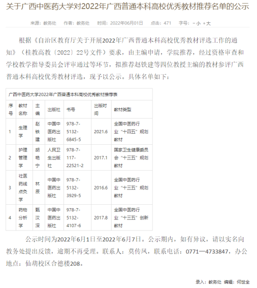 我教研室“十三五”规划教材《壮医药线点灸学》获得2022年区级优秀教材