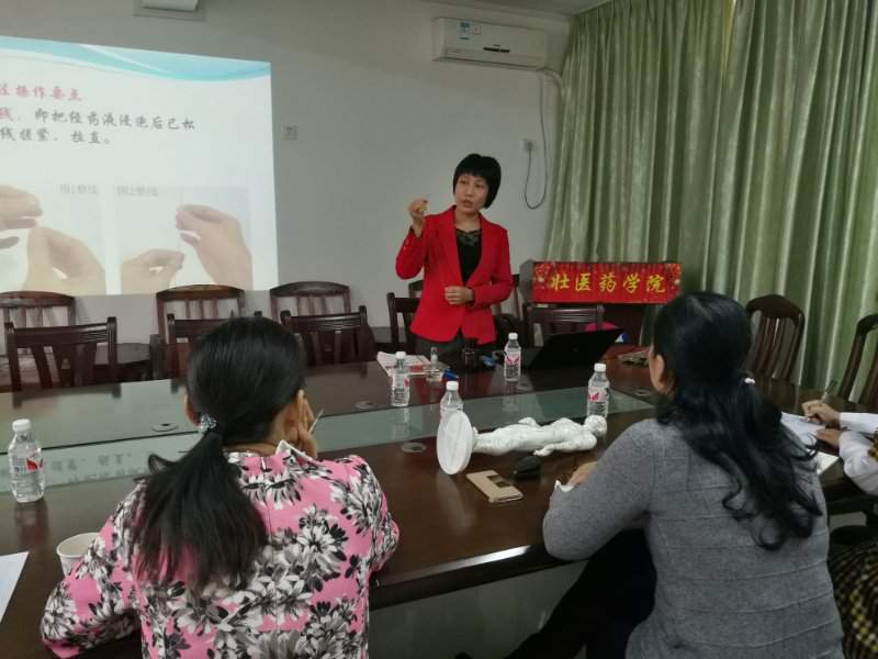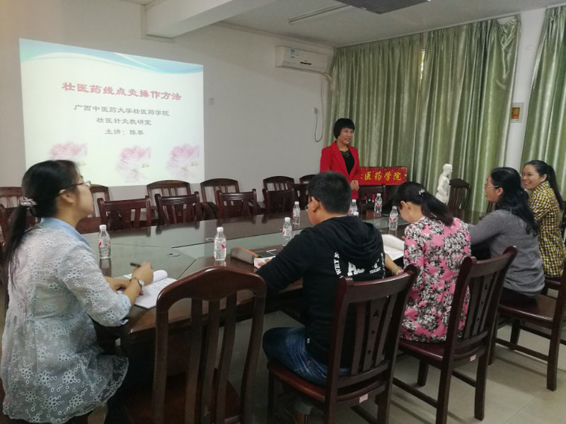 壮医药学院教研室学术交流活动 ——壮医药线点灸技法 发布时间:2017-12-12 15:30:21 浏览次数: 次 【字体:小 大】 为了促进教研室之间的交流学习,提高教师的专业知识水平和业务能力,我院各教研室联合举办系列壮医基本知识和技法学习系列活动。2017年11月1日在壮医药学院201会议室举办活动系列一,邀请壮医针灸教研室主任陈攀副教授主讲《壮医药线点灸技法》。 陈攀副教授为各位老师详细地讲述了壮医药线点灸疗法的操作方法,激发了大家对壮医药线点灸疗法浓厚兴趣,学习交流现场气氛活跃,大家获益匪浅。 分享到: 【打印正文】