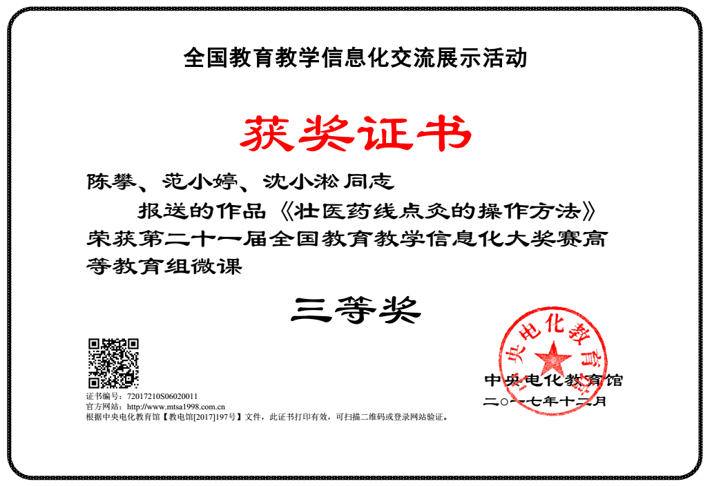 近日,“第二十一届全国高校星空网页游戏官网信息化大奖赛”在北京圆满落下帷幕。我教研室报送的作品《壮医药线点灸的操作方法》荣获了大赛高等教育组微课三等奖的佳绩。