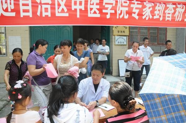 为了让地处偏僻的广大群众更深入地了解健康科学,了解祖国传统医学,科技服务农村,科技下乡,送医下乡,2011年8月30日,壮医药学院院长、广西名中医、著名壮医专家林辰教授等一行5人在自治区科技厅政策法规与社会发展处莫冰云处长、农村科技处董颖聪处长、发展计划处李思源副处长的带领下,深入到融水县香粉乡开展了义诊服务和流感防治、艾滋病防治科普知识讲座等,为香粉乡群众提供了较好的健康诊疗服务和医学科学知识咨询及健康科普讲座活动。