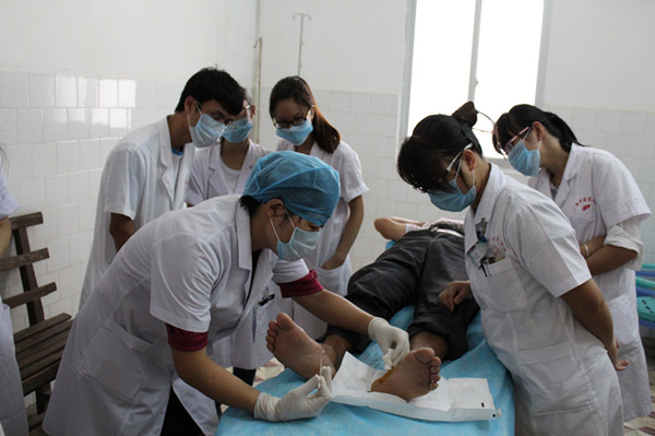 在这次活动中,带队老师和同学们通过“内科病房查房”、“中医科见习”、“观摩小针刀疗法”、“跟随广西名中医林辰教授义诊”、“实践壮医经筋手法和壮医针刺疗法”及向群众发放民族医药调查问卷等,增长了临床知识,拓宽了同学们的视野。在跟随内科张主任查房的过程中,同学们初步了解了住院病房常规的工作程序,学习了内科常见病的临床诊疗方法,真正接触了临床一线工作,学会了危重病人急救的措施和基本方法;在中医综合科见习的过程中,同学们熟悉了常见的针灸推拿、熏洗、刮痧、贴敷等技法,并将自己所学的壮医经筋手法和壮医针刺疗法应用于临床,为当地百姓服务,实现了真正的理论与临床实践相结合,加强了自身临床实践动手能力;在跟随广西名中医林辰教授义诊的过程中,同学们实习了望、闻、问、切四诊和临证处方用药的技巧,拓展了课堂知识,同时见证了壮医针刺的独特针法和神奇疗效;观摩了合浦县第五人民医院张雪院长的小针刀疗法,留下了深刻的印象,在目睹了小针刀疗法神奇的疗效之后,同学们无不惊叹张院长精湛的技术,同时也激发了自己要更加发奋努力学习,为患者解除病痛的信心。