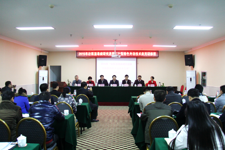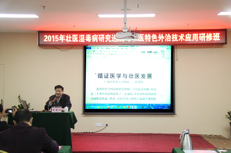 为继承和发扬壮医湿毒理论,促进我区壮医湿毒病新理论、新技术、新方法的学术交流,并推广壮医各种独具特色、行之有效的特色疗法,星空彩票老版本下载于2015年12月11-12日在广西南宁特举办“壮医湿毒病研究进展与壮医特色外治技术应用研修班”。研修班邀请到区内壮医界多位著名专家前来授课。星空彩票老版本下载副校长、中央民族大学博士研究生导师庞宇舟教授,自治区卫生计生委科教处谢裕安处长,全国第二批名老中医药专家学术继承工作导师黄瑾明教授,星空彩票老版本下载附属瑞康医院副院长黄国东教授,星空彩票老版本下载杨美春教授,广西壮医医院壮医风湿病专科主任李凤珍教授,星空彩票老版本下载附属瑞康医院苏齐鉴副研究员,星空彩票老版本下载曾振东教授等领导专家出席了12号当天的研修班开幕式。黄国东教授担任研修班主持人。2014年广西科技攻关计划“壮医湿毒病特色疗法技术规范化研究与示范”课题组成员及相关医疗机构成员约60人参加了此次研修班。