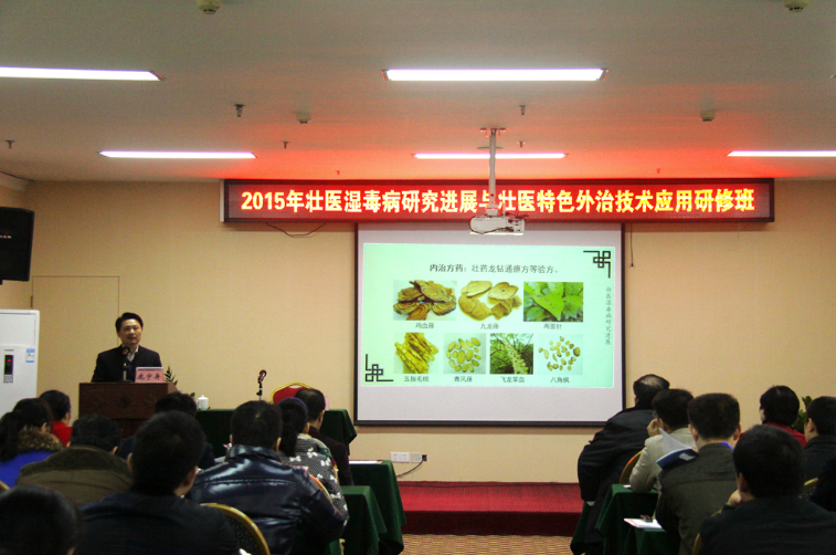 自治区卫计委科教处谢裕安处长在讲话中表示,全国壮族总人口约1800多万,90%以上聚居在广西。壮医药是广西壮族人民在漫长的生活实践中形成和发展起来的独特民族医药,积累着具有当地防治疾病特色的经验。2012年,广西政府把“提升中医药民族医药服务能力和水平”列入广西“十二五”医药卫生体制改革规划暨实施方案当中。本次研修班会议采用理论培训与实践培训相结合的方法,不仅分享和推广2014年度广西科技厅攻关项目的阶段性研究成果,而且邀请多名壮医资深临床专家和统计学专家进行理论讲解和操作演示,对于提高壮医诊治水平和科研认识,以及推动壮医药的科技创新、学术繁荣、区内外学术交流合作具有重要的意义。