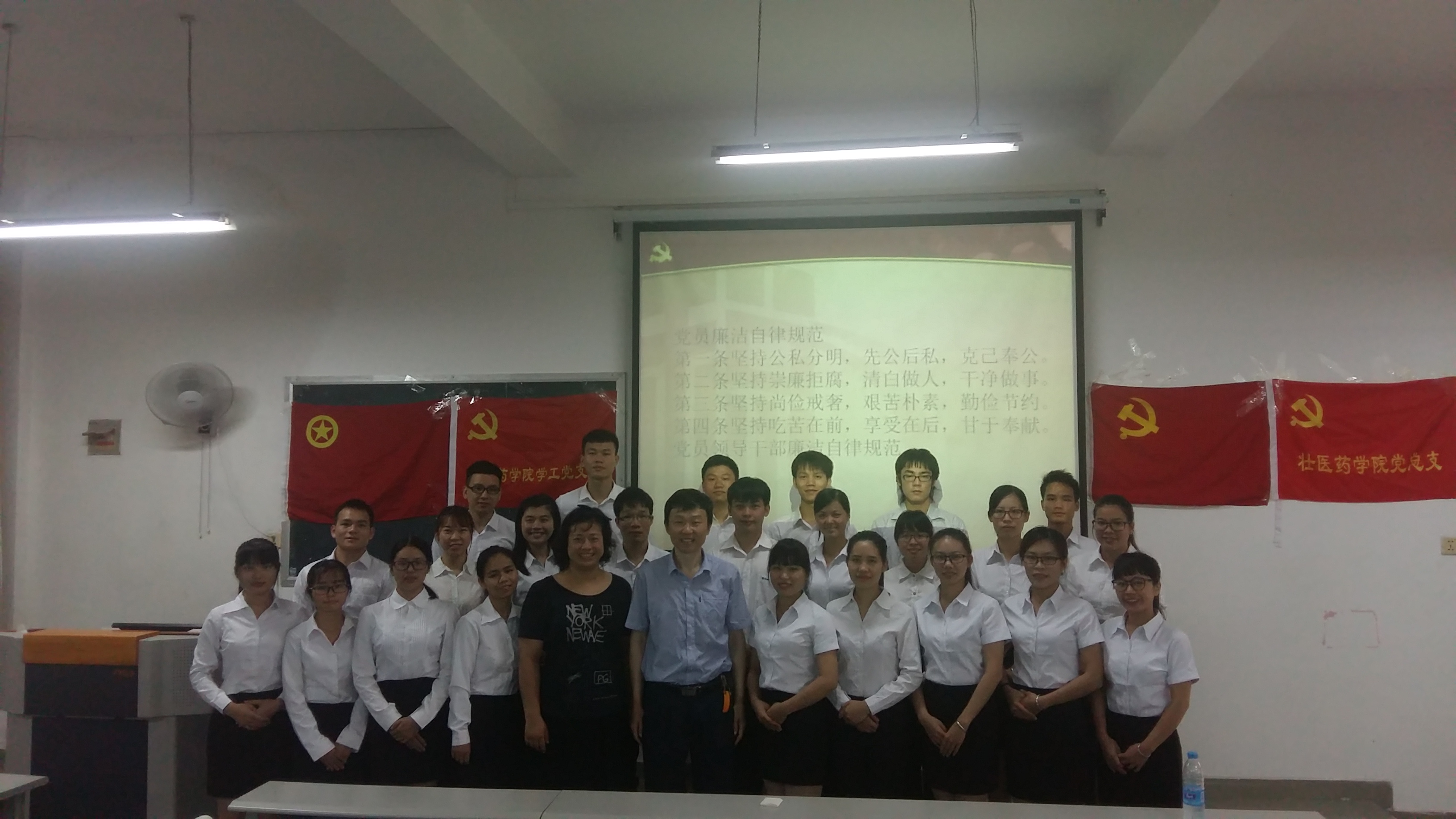 2017年6月23日壮医药学院学工党支部在明秀校区西a座教室开展“纪念建党96周年”主题建党日活动,同时进行党史、党风、党性学习教育。壮医药学院党总支书记张煜、学工党支部书记兰天莹、学工党支部全体学生党员参加此次活动。