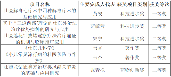民族医学(壮医学)学科多名成员的获奖,反映了本学科在日常管理、项目组织、科学研究和工作中的协同努力和优秀表现。这些荣誉的取得,是壮医学学科内专业人士共同努力的结果。这些奖项也起到了榜样的作用,将激发更多人投入到学科研究和发展中。