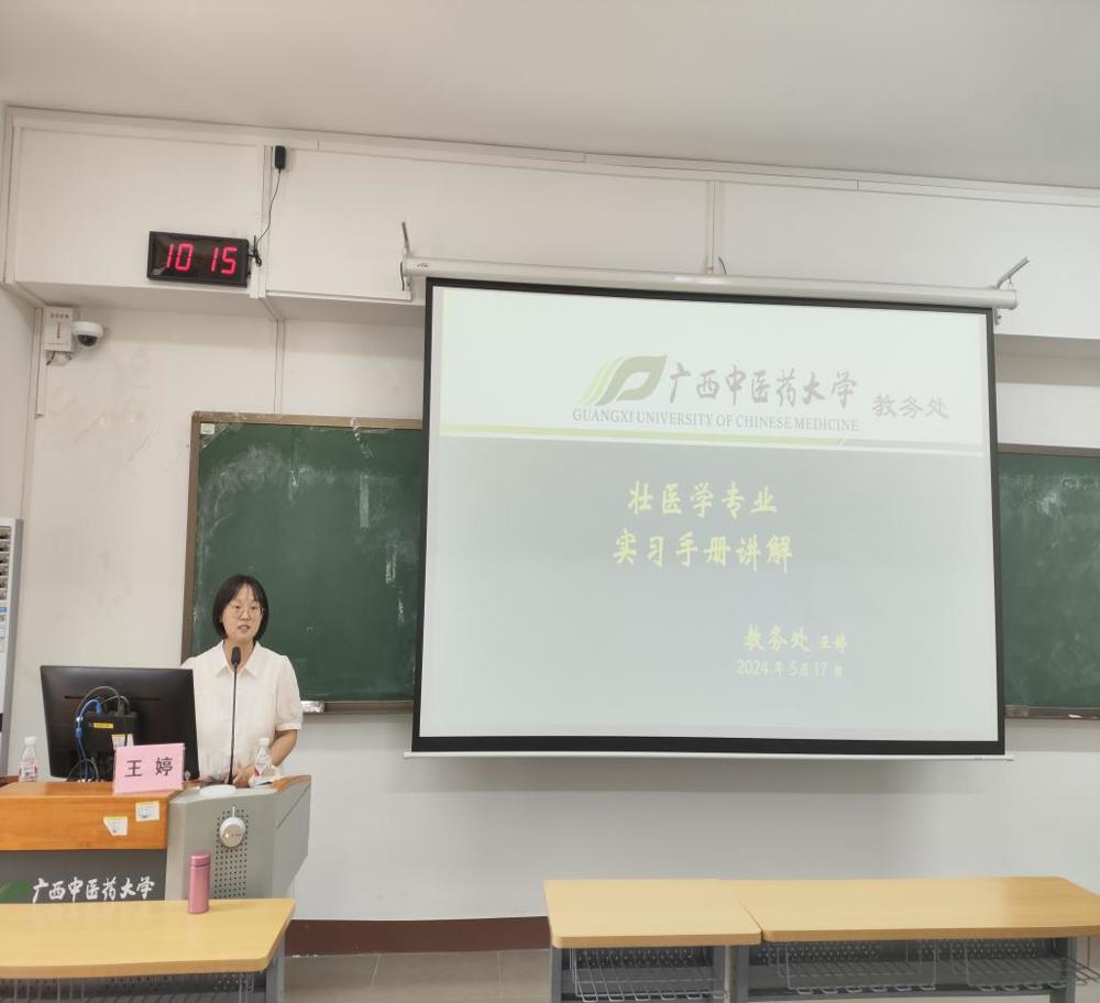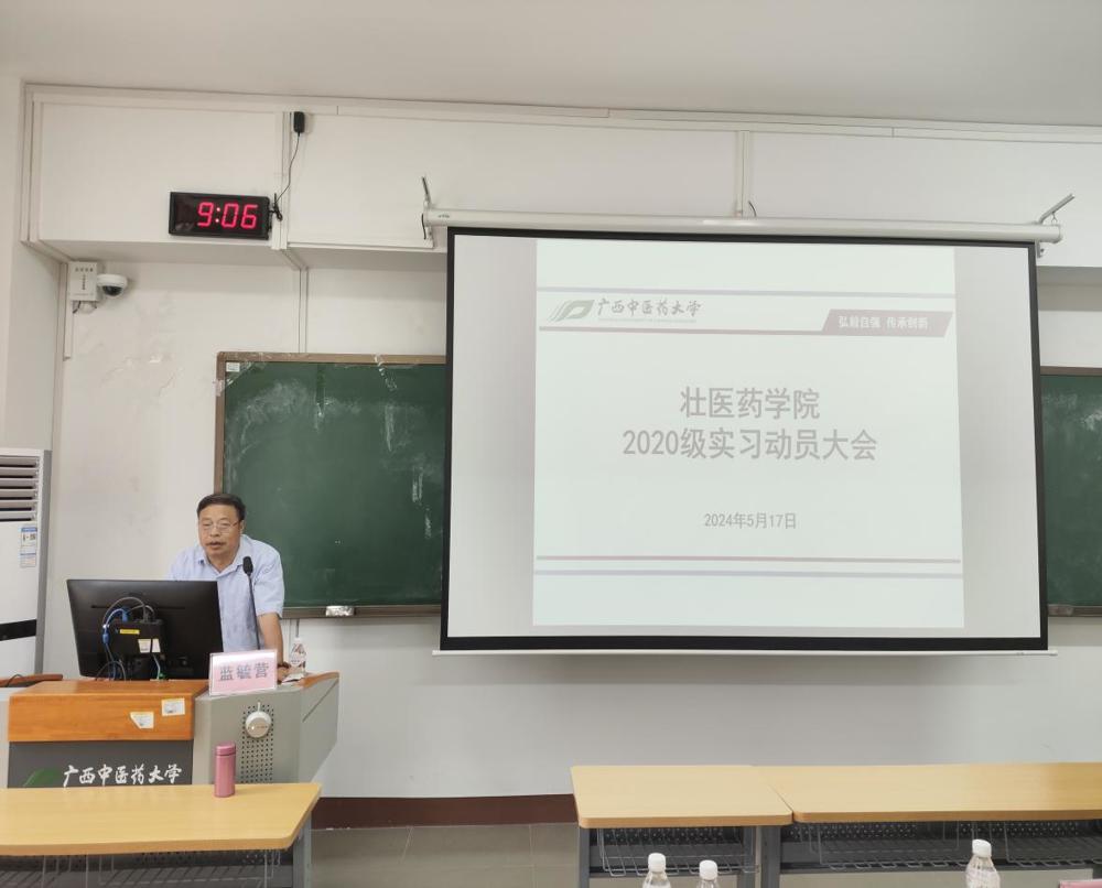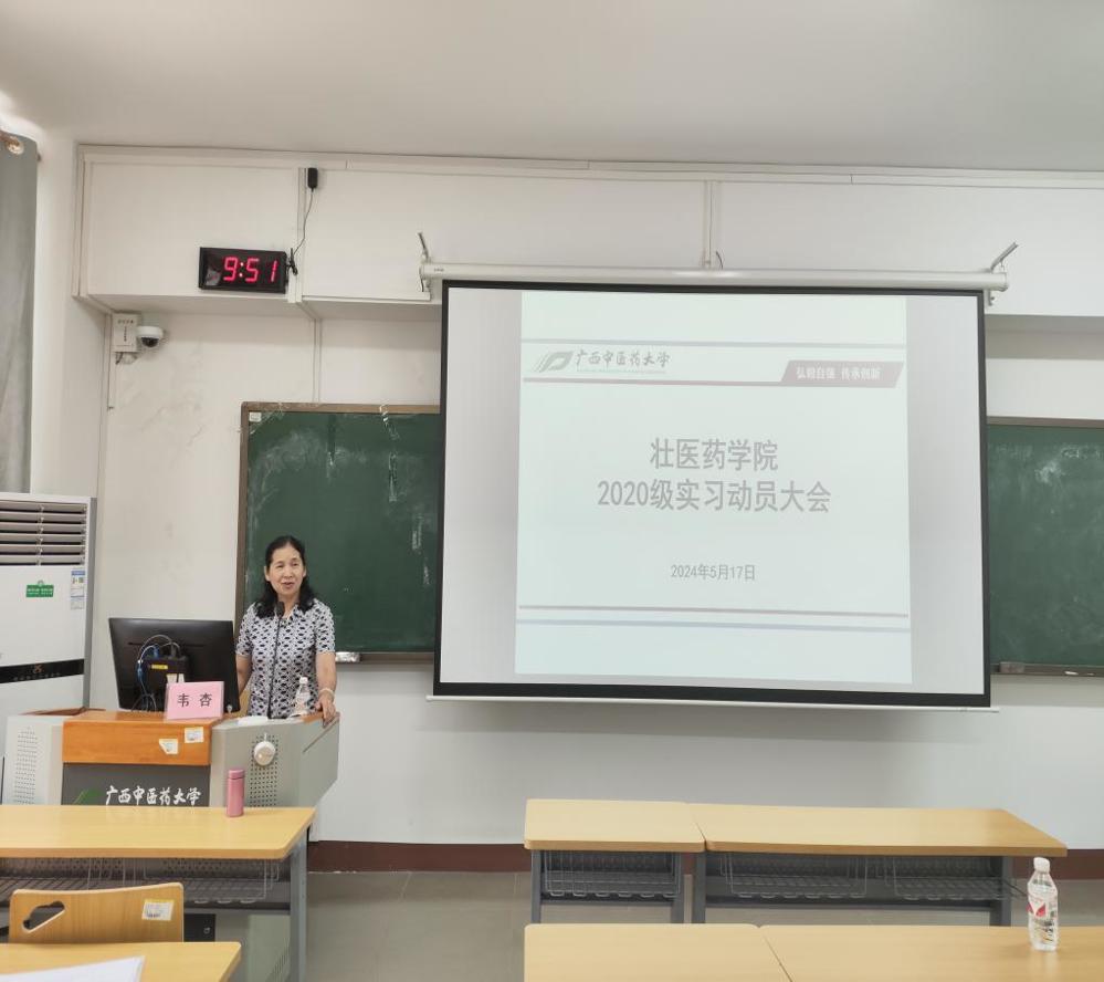 5月17日上午,壮医药学院于明秀校区时珍楼402教室召开2020级实习动员大会。壮医药学院党委书记张煜、院长蓝毓营、副处级调研员韦杏、教务处实习管理科王婷老师、2020级班主任张云芳老师以及壮医药学院2020级壮医学全体学生参加了此次动员大会。会议由2020级辅导员刘婷老师主持。